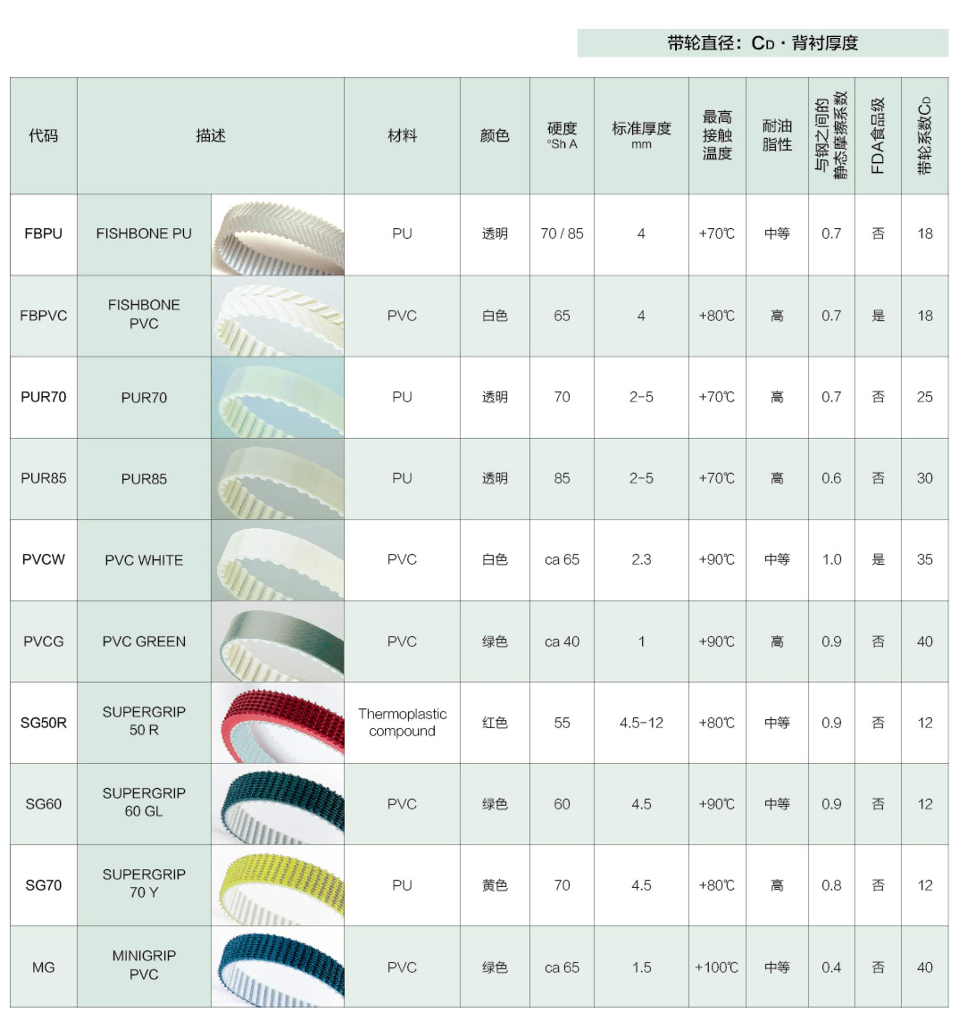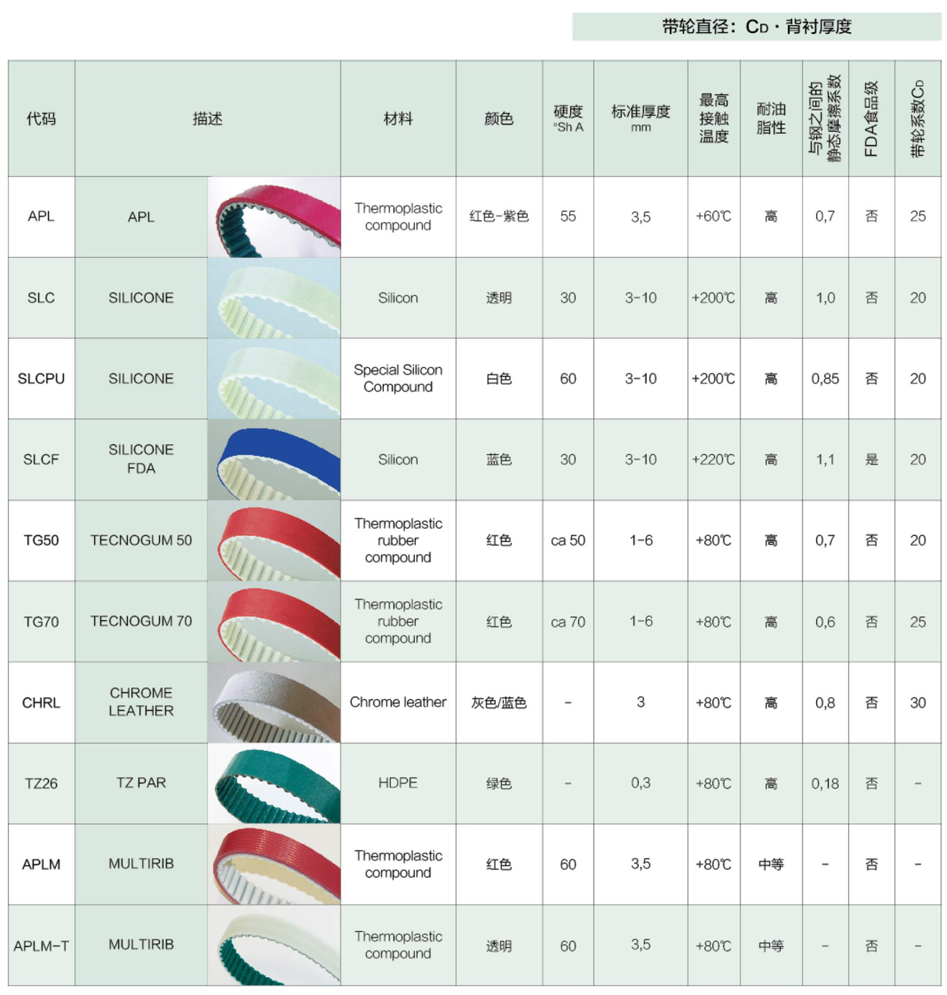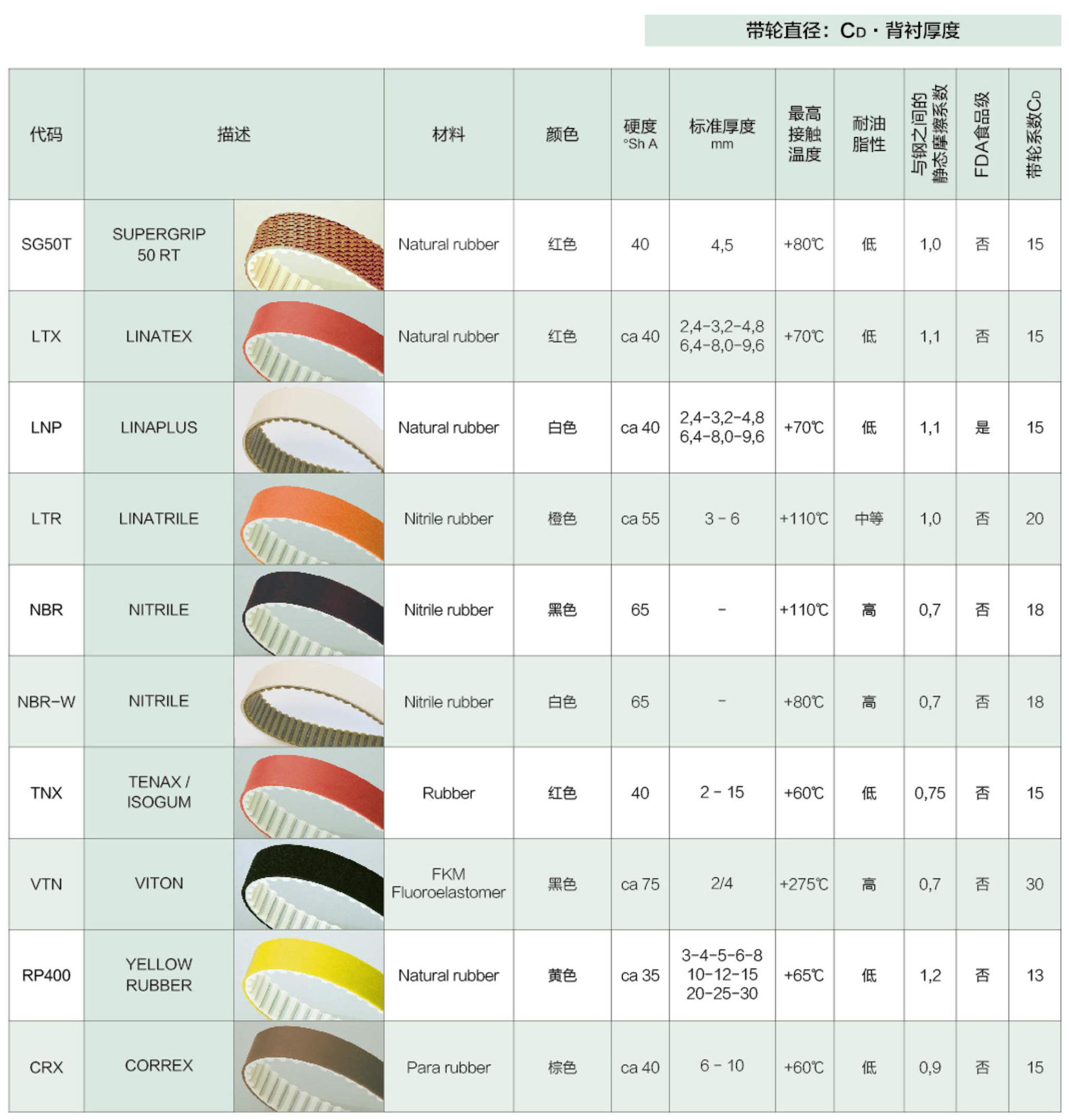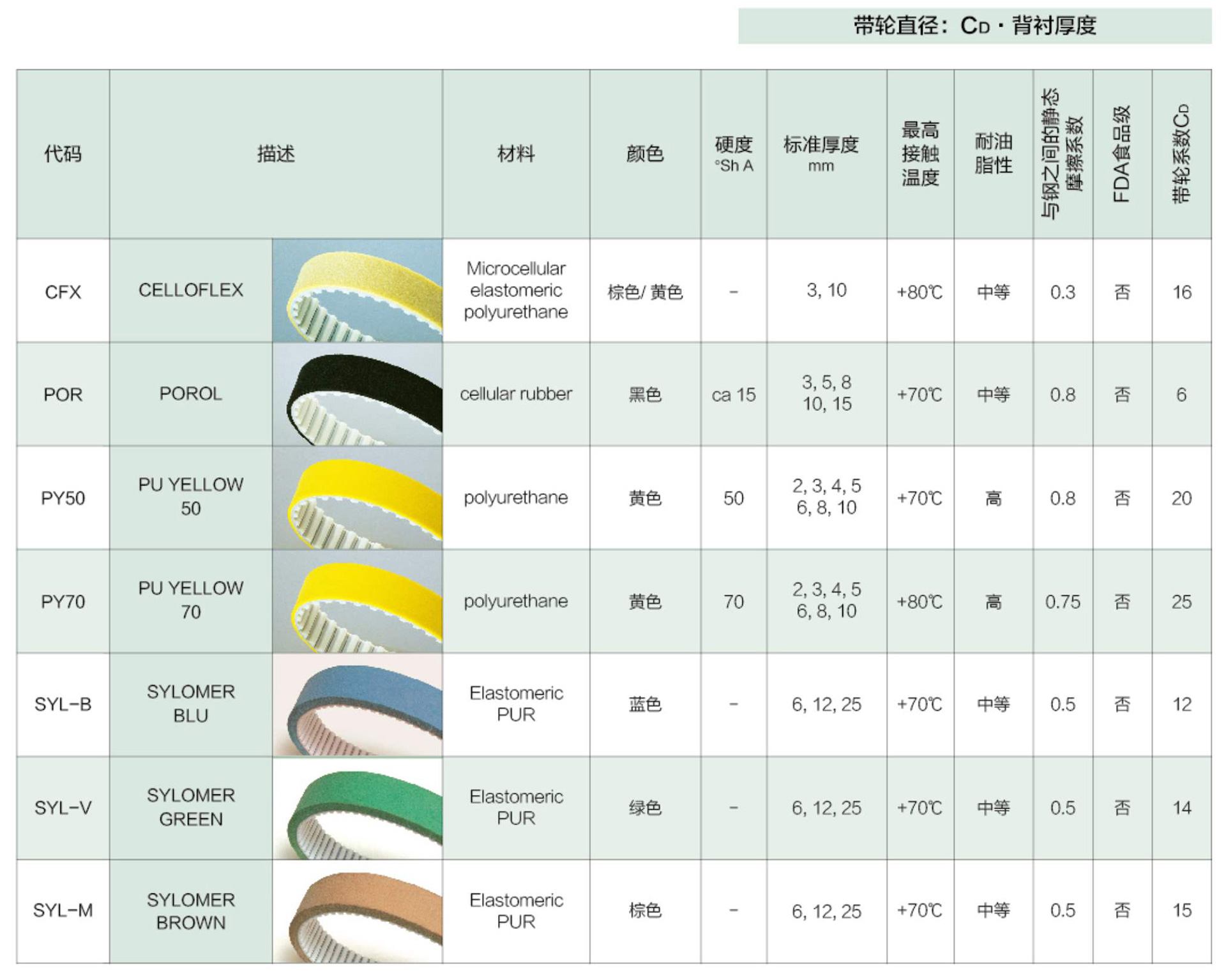 | PAZ | 齿面使用聚酰胺背衬,降低摩擦系数,改善带齿啮合。 | 静态摩擦系数 |